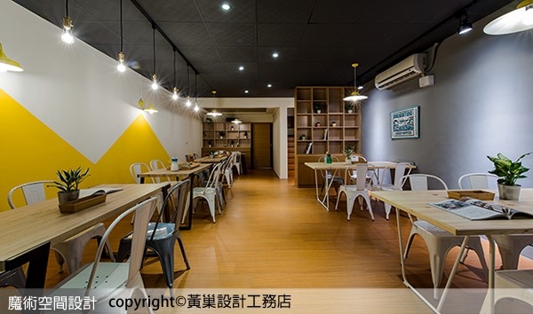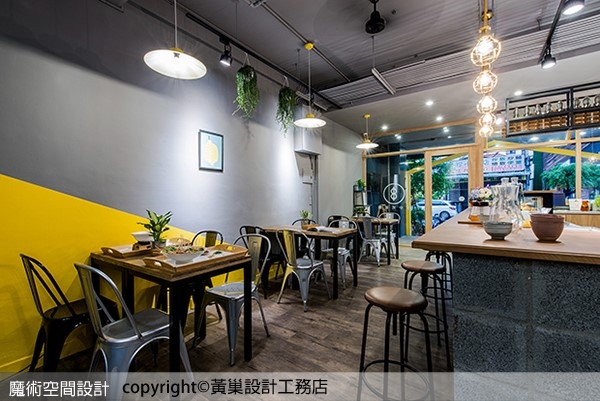 6.▲黃巢設計工務店保留裸裎管線的天花板刷色處理,立面也以灰、黃、藍為主色,揮灑出工業風設計感。