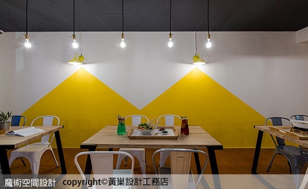 13.▲僅微改造的空間以色彩發揮設計強度,天花深灰色、牆面淺灰及局部黃,輔以燈光搭配,生動空間氛圍。