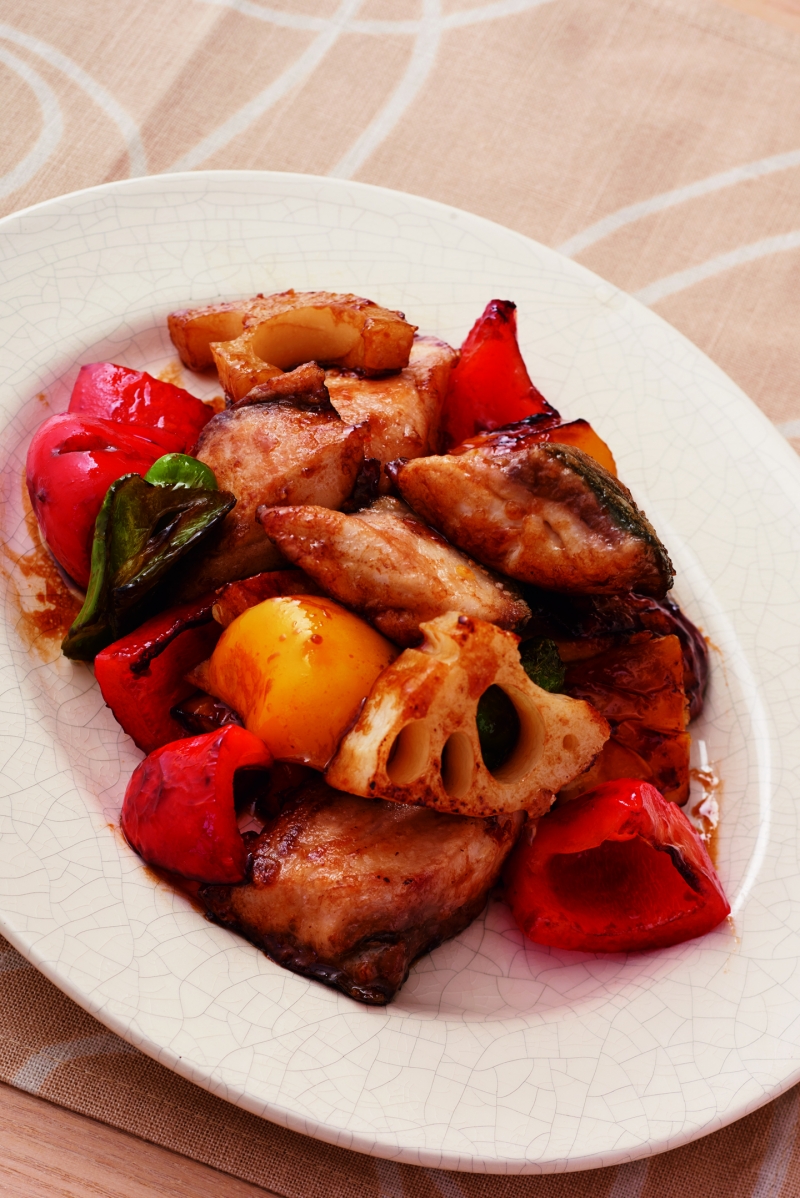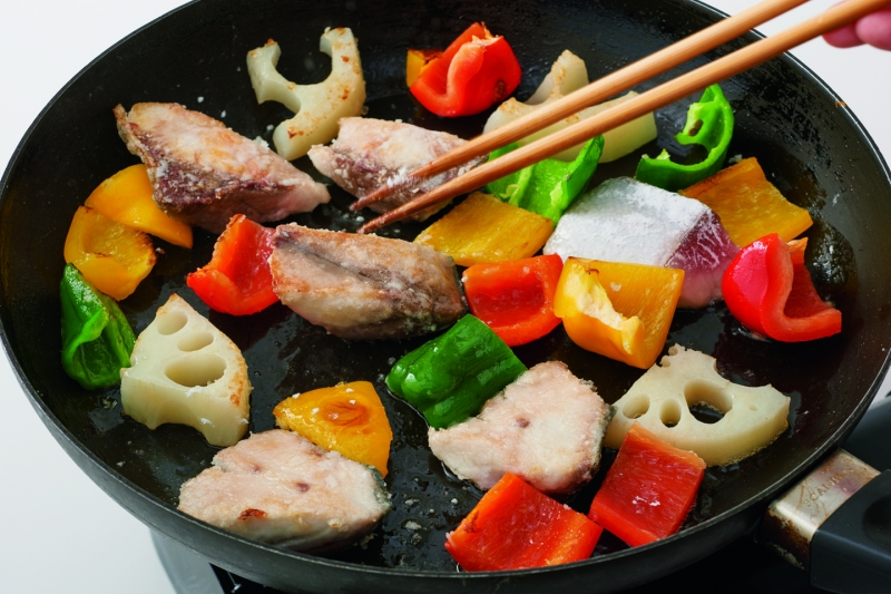 - 青魽切成一口大小,整個沾滿片栗粉後再拍去多餘的粉。彩椒、青椒、蓮藕都切成易入口的大小。