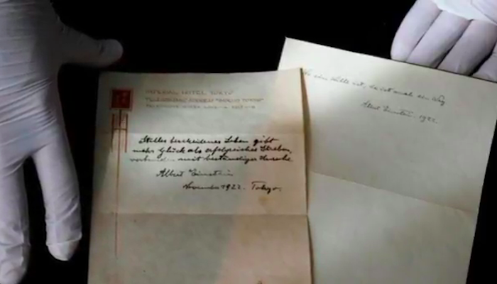 著名物理學家愛因斯坦(Albert Einstein)在九十五年前寫有談論快樂的兩張親筆字條,24日在以色列耶路撒冷拍賣,以180萬美元成交。(視頻截圖)