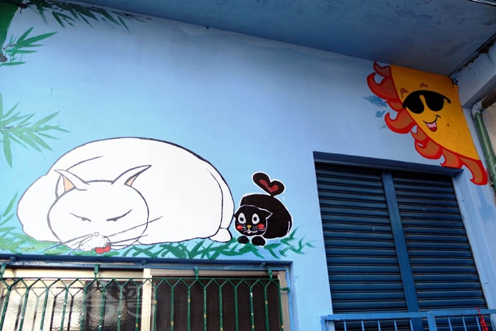 圖說:街巷兩旁隨處可見幸福洋溢的貓咪彩繪塗鴉,家家戶戶的牆面、窗戶、地板都變得活潑有趣、充滿魅力/玩全台灣旅遊網特約記者阿辰攝