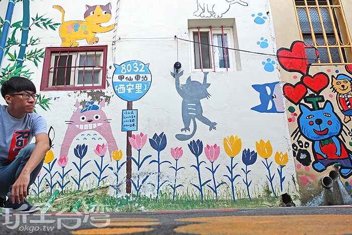 童年記憶裡熟悉的電視卡通角色加菲貓、湯姆貓也都在這裡一一出現,將巷內的窗框、水管、洗衣機、小花雜草融入彩繪背景裡,令人會心一笑。最後走到巷尾時,一定要在充滿童話色彩般的甲仙車站站牌下演演等公車的場景,有趣的是,有隻龍貓正笑咪咪的陪伴在一旁唷!遊覽貓巷才不到幾分鐘時間,玩心徹底被點燃了呢!