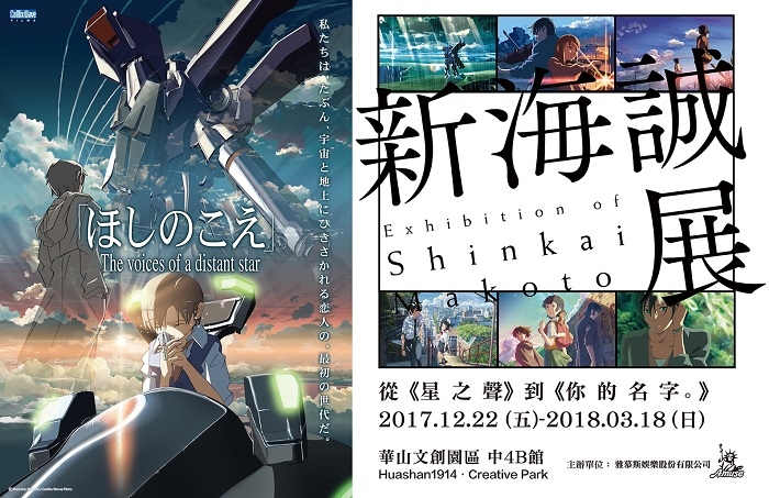 席捲台灣動畫票房的《你的名字。》動畫導演新海誠,12月22日起至明年3月18日將在台灣華山1914文創園區中4B館展出出道15週年的軌跡。「新海誠展 從《星之聲》到《你的名字。》」海外首站特展,從新海誠一手包辦導演、劇本、演出、作畫、美術、剪輯等的商業出道作《星之聲》,到近期締造世界票房紀錄的《你的名字。》等6部作品,皆在展覽中被完整呈現。除了珍貴的製作手稿及分鏡,還有台灣展覽限定、能夠充分體驗電影世界觀的立體展區,保證令新海迷們大呼身歷其境。