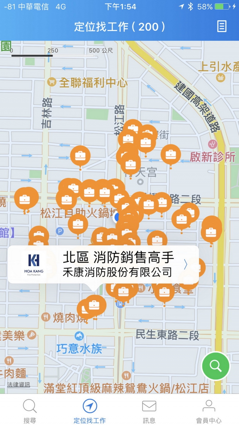 「518找工作」和「104工作快找」的主畫面設計很相似,基本上都是客製化一個主畫面,把自己認為應該單獨拉出來的功能圖示放上去,唯一的差異是「104工作快找」還額外提供了一個左上角的下拉式選單可開啟換不同的功能,但「518找工作」則是採取退回到主畫面再重新選擇功能的使用動線。兩者類似的設計也出現在工作的搜尋結果頁中,上方同樣提供了地區、職務類別與進階篩選的二次篩選機制,能夠呈現更精準結果。