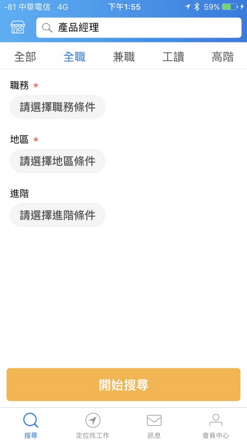 「yes123找工作」畫面的頂端固定做為功能選單之用,不知是不是顯示網頁內容的緣故,切換頻道或內容時,畫面會有明顯的卡頓感,例如在搜尋工作時,即使只是變更查詢條件,畫面也會先暗下來再重新亮起來,有點像是另開新頁感覺。原生的APP因為會有過場動畫設計,所以不會出現這種明暗交替的翻頁感,這是「yes123找工作」有待進步的地方。