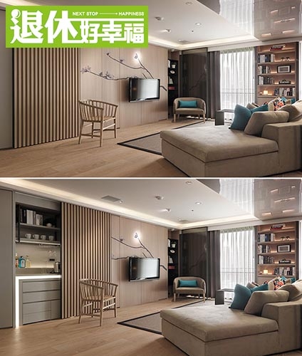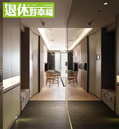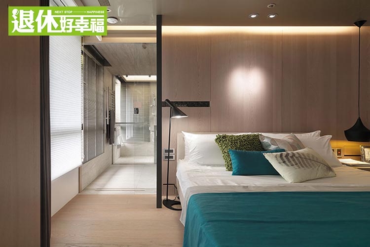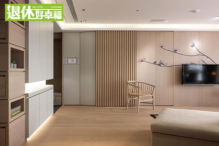 室內採無障礙設計,避免設置門檻,坡度符合法規低於1:12,讓地板平整零落差;走道寬度加大至少90公分,方便輪椅進出,部分甚至有120公分,讓輪椅可以轉向迴轉,所有房門也使用拉門設計,乘坐輪椅的銀髮族能輕鬆開啟。調整櫃體高度範圍至黃金收納區,不費力就能輕鬆拿取,高處衣櫃規劃油壓升降吊衣桿,並在較高收納位置上側貼鏡子,不用爬上去就可一目瞭然,最低處設計腳一踢就能打開的抽屜,提升取物方便性。