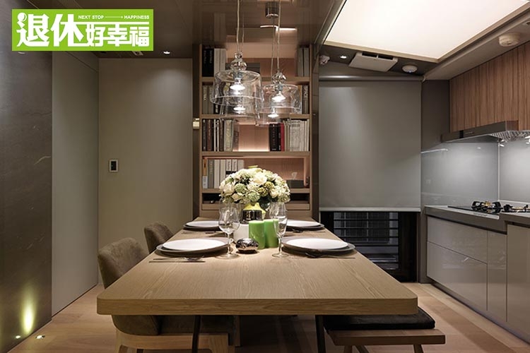 上櫃採自動升降櫃形式,讓長者可輕易開啟,並退縮廚具櫃下櫃,方便輪椅靠近也防碰撞。