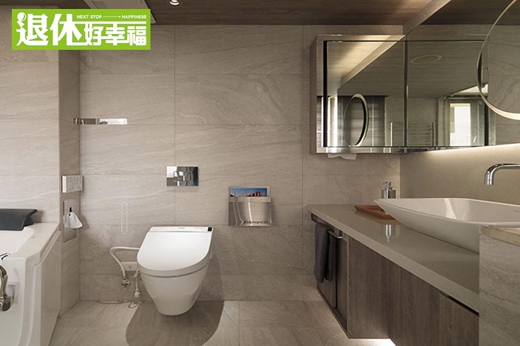 在規劃廚房和衛浴也格外留意防撞防滑,退縮廚具櫃下櫃,讓輪椅輕鬆靠近,上方吊櫃採自動升降設計,長者得以輕易取物。衛浴空間善用矮牆作為扶手設計,讓行動緩慢的銀髮族有支撐,並設置止滑地板、走入式浴缸、大理石截水溝及退縮下櫃,以體貼友善的設計,大大提升長者居家安全係數。