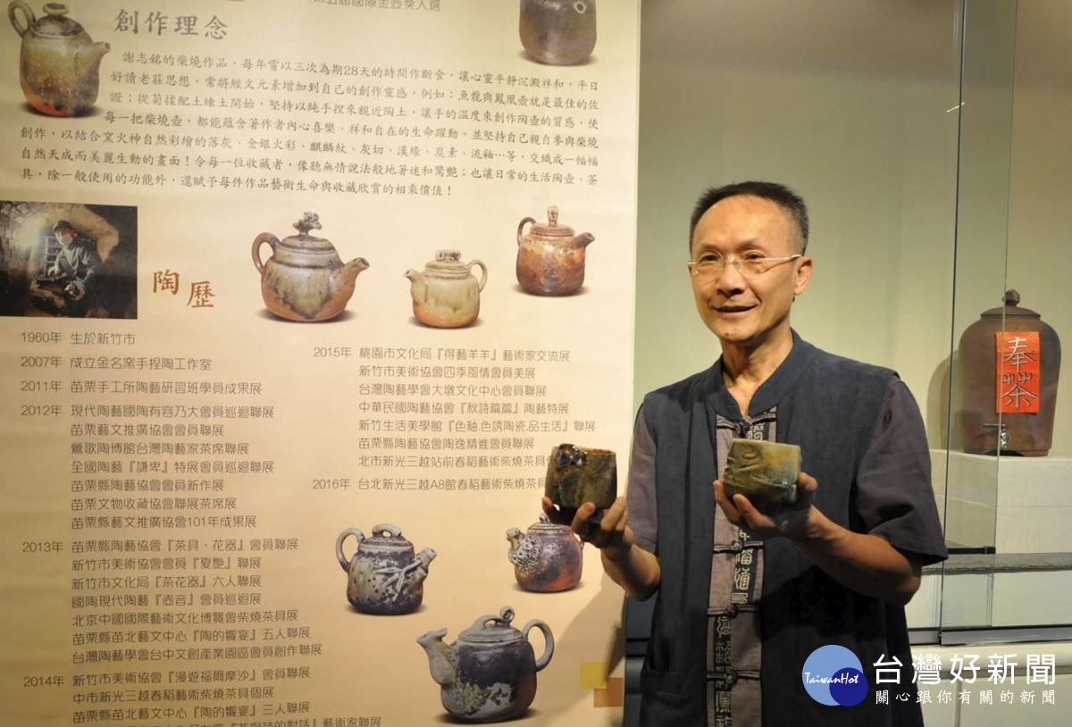 謝志銘老師年輕時從事油畫創作、捏塑紙黏土,爾後投身到兒童美術教學,長時間在藝術創作與教育領域上不斷耕耘,滋養臺灣藝術界的沃土,是藝文界莘莘學子的典範。12年前,謝志銘老師偶然與家人出遊時接觸到手拉坏,從此與陶藝成為生命共同體,尤其,對陶藝技術中,最困難而耗時的「柴燒」領域產生強大的共鳴。