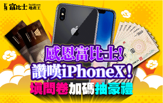 富比士地產王滿七歲嘍!為了歡慶七周年,富比士地產王將於臉書粉絲專頁舉辦「感恩富比士,讚嘆iPhone X,填問卷加碼抽豪禮」活動。獎項包括Apple iPhone X 64G、新光三越千元禮券、市價2180元的SoLaLa護手霜禮盒、市價1800元的SoLaLa漱口水禮盒,以及威秀影城電影票,民眾只需參加活動,並完成三個抽獎步驟,就有機會把這些獎品帶回家。