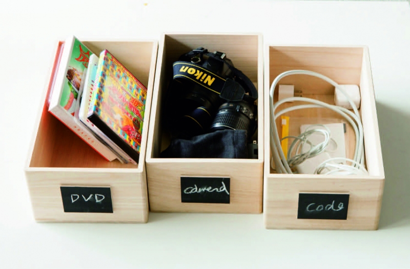 上面的照片是放在客廳鐵架上的箱子。左起依序放置DVD、相機相關物品、手機等用品的電源線。請記得, 如果將箱子塞得滿滿的會很難取用,所以要留有空間。