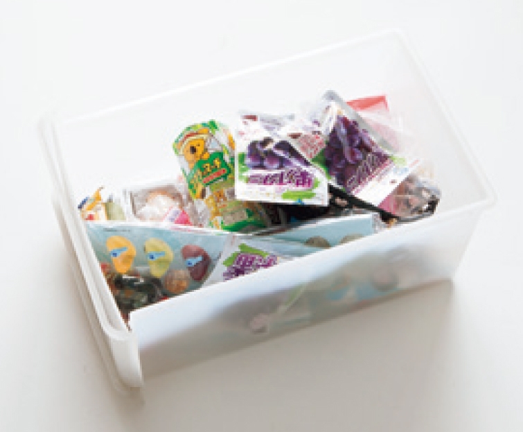 零食放在收納抽屜裡,食譜、家電的說明書各放在一個箱子。