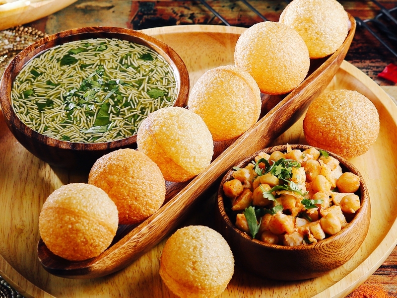 芒果酸子酥球在印度大街小巷都可品嘗到,為了讓口感更出色,主廚Andy花了三四個月的時間,不斷的研發各式不同比例的香料變化及最佳的配方比例。這道菜的吃法好玩又有趣,首先將酥球輕敲或是用拇指按壓出一個洞,再放入馬鈴薯泥和鷹嘴豆食材,佐以芒果酸子做的醬汁,豪邁一口咬下,微酸微辣口感,經過咀嚼後竄出不同辣味層次感,讓人感動。主廚Andy分享,芒果酸子酥球外層酥脆的秘密是,麥粉與麵粉調和水後經過一個晚上發酵,才能變出這道美味佳餚。