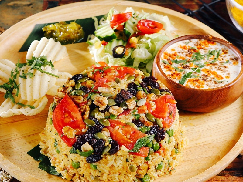 廚師精湛刀工,將小番茄變成一朵鮮艷欲滴的玫瑰花,引人入勝,再搭配少許的辣椒、小黃瓜、香菜、馬鈴薯等食材製成新鮮特調優格醬,搭上堅果飯,微微酸甜滋味讓人迷戀。或是搭配深受長輩們青睞的有機生菜沙拉享用,也是很棒的選擇。