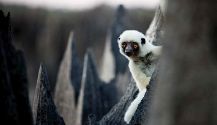 一隻鄧氏跳狐猴悠然自得地生活在石林尖山裡。本圖選自《國家地理終極旅遊:全球50大最美荒野》