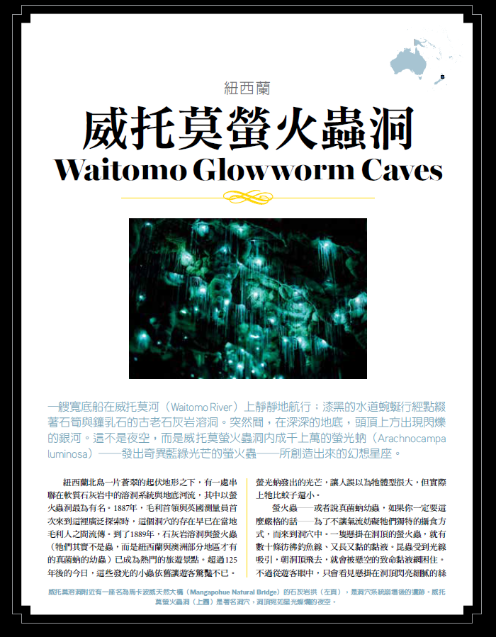 一艘寬底船在威托莫河(Waitomo River)上靜靜地航行;漆黑的水道蜿蜒行經點綴著石筍與鐘乳石的古老石灰岩溶洞。突然間,在深深的地底,頭頂上方出現閃爍的銀河。這不是夜空,而是威托莫螢火蟲洞內成千上萬的螢光蚋(Arachnocampaluminosa)─發出奇異藍綠光芒的螢火蟲─所創造出來的幻想星座。