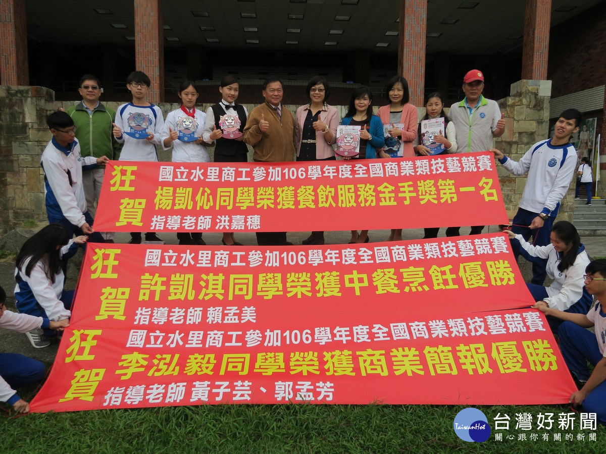106學年度全國高級中等學校商業技藝競賽上週於台南高商舉行,全國共100多所公私立學校選手代表同台較勁。國立水里商工成績表現特別突出,報名四位選手參加四項職種比賽,榮獲1金手獎第一名、2優勝的佳績,獲獎率75%,尤其餐飲服務項目稱霸全國,創下學校歷年來最好的成績。