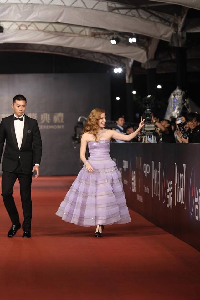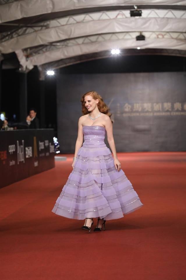 這次以伯爵大使的身份出席金馬獎的好萊塢影后潔西卡雀絲坦(Jessica Chastain),早上才與老公到達台灣的潔西卡雀絲坦,這次穿上粉紫色禮服,配戴PIAGET珠寶美豔登場。