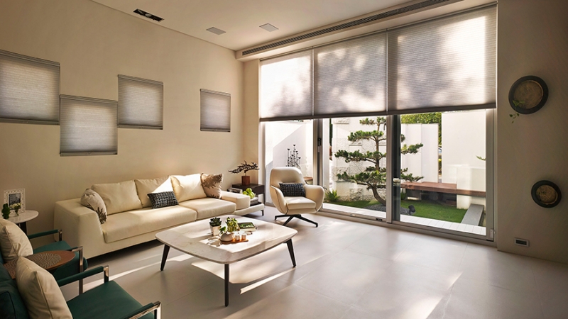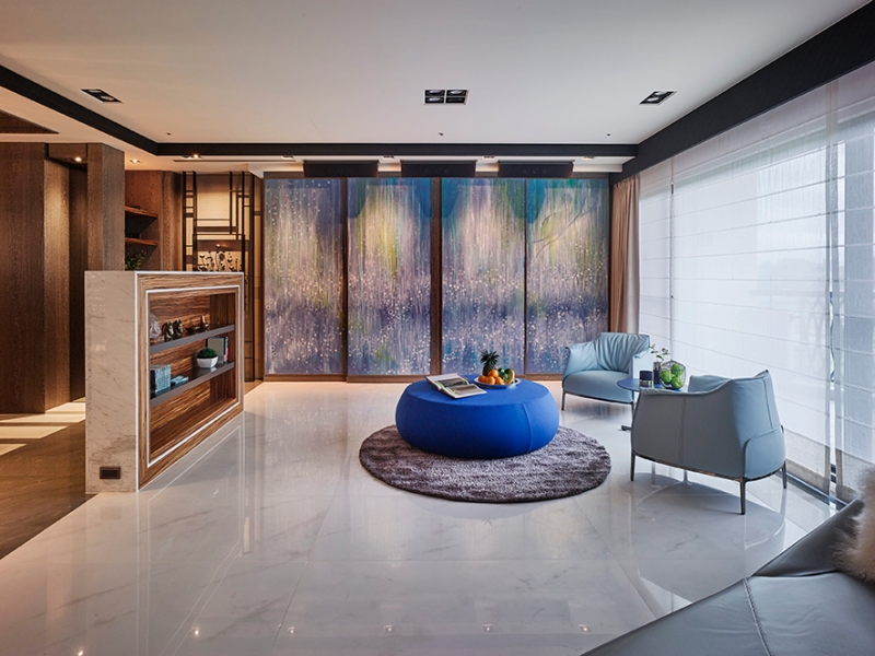 玄關處設置,拉開為門,闔起為畫。將水墨藝術融入其中,交織中國水墨畫的留白技巧,創造具有審美意趣的居家空間。家具的配色及植栽盆的掛置,讓綠意自然地融入生活,和窗外的庭院意象相互呼應。並運用穿透的玻璃窗,使客廳的空間隨天色而有不同的景致變化,即便身處家中也能感受自然的氛圍。