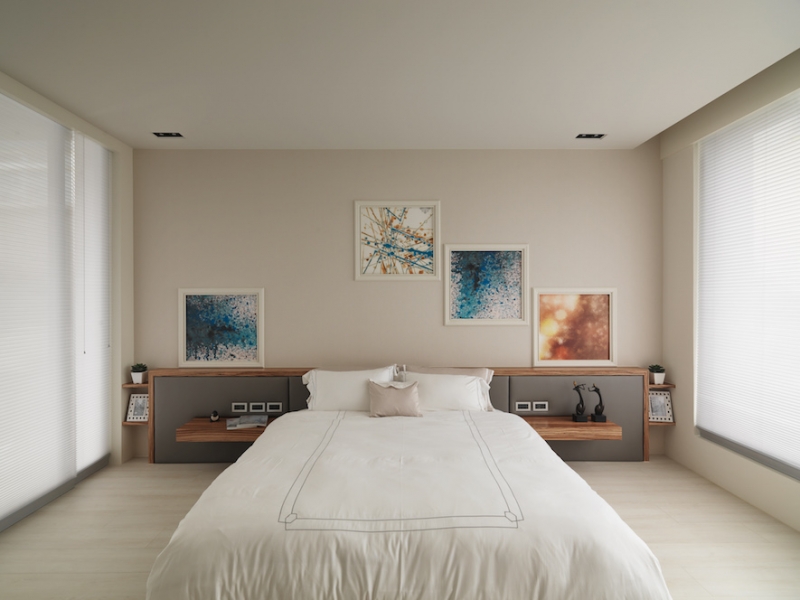 臥室以清爽舒適的淺暖色調,營造舒心的睡眠環境。同樣以玻璃窗打造穿透性效果,使自然光線進入居家空間;兩邊大幅面積對立的落地窗,視域更加寬闊。窗戶捲簾特殊設計,讓每一道窗成為一幅畫;白天是透視的窗,夜晚是美麗的畫,整體空間多了幾分意趣!