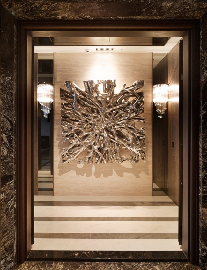 透過入口「老樹根」的雕塑作品,揭開藝術與空間的融合序幕。鐵工師傅將剛與柔的線條,表現的淋漓盡致。石材的分割與結合,呈現出不同的紋理。設計師將其彙集統合,只為讓居住者擁有一個有溫度、有意境的生活場域。