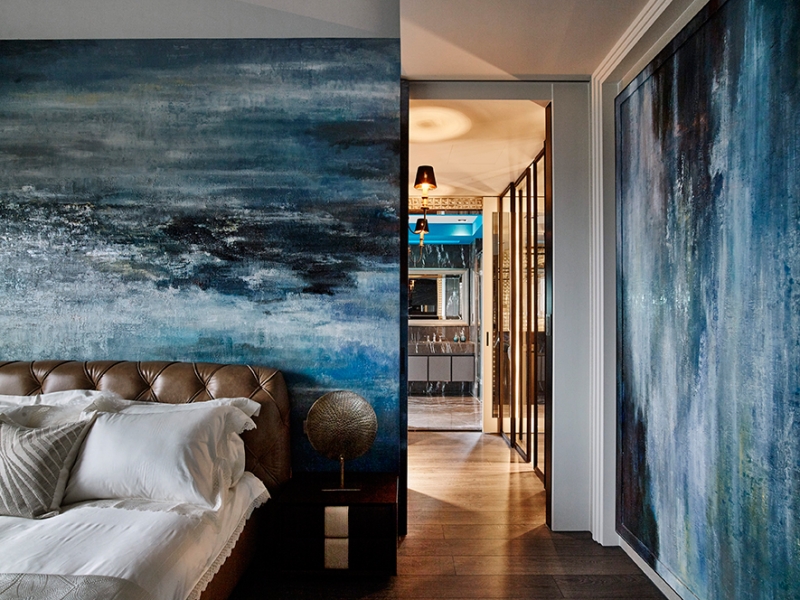 主臥的壁面意象,恣意揮灑一抹藍,如雲海山嵐般;想像如鳥飛翔、如魚悠遊,山嵐雲海盡攬其中,營造沈靜放鬆的舒眠環境。純厚溫潤的木質地面及沙發床板,以土地的意象為襯托;整體空間饒富自然意蘊,加強空間感及視覺效果。