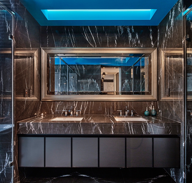 有別於公領域的暖色調,浴廁空間以黑色大理石平衡色溫,帶出低調中的奢華感。大面積的鏡面,營造通透寬敞的視覺感受,使空間具延伸效果。由天花延伸至鏡面、檯面與櫃體,明確的線條分割及和諧的色系搭配,突顯強烈的氛圍 與空間氣勢。