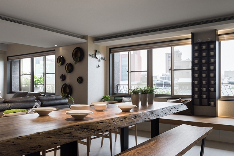 在設計上為解決天花大樑過低的問題,將天花的線條從玄關到客廳做直線延伸,平行於電視牆面、沙發及木質餐桌,讓空間的水平軸線更加被強調。在臥榻區特別量身訂製一個鐵製茶杯陳列架,讓愛喝茶的主人可以在此招待他的朋友們,一群朋友話家常品茶香。