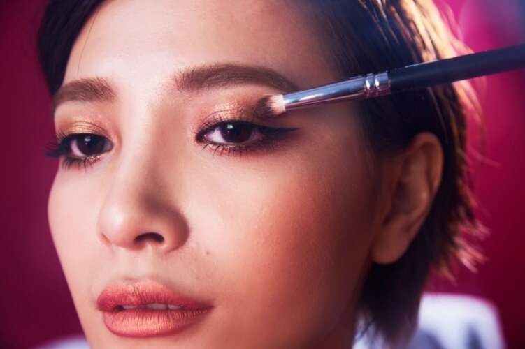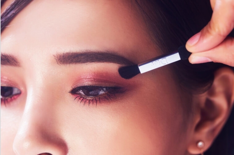1.鬆刷沾取酒紅眼影,從眼窩中間往後刷到眼尾,餘粉再往後暈到眉尾