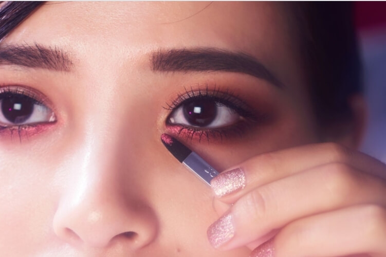 2.紅珠光眼影畫在前段臥蠶、及眼褶中間,記得珠光範圍不要超出眼褶太多