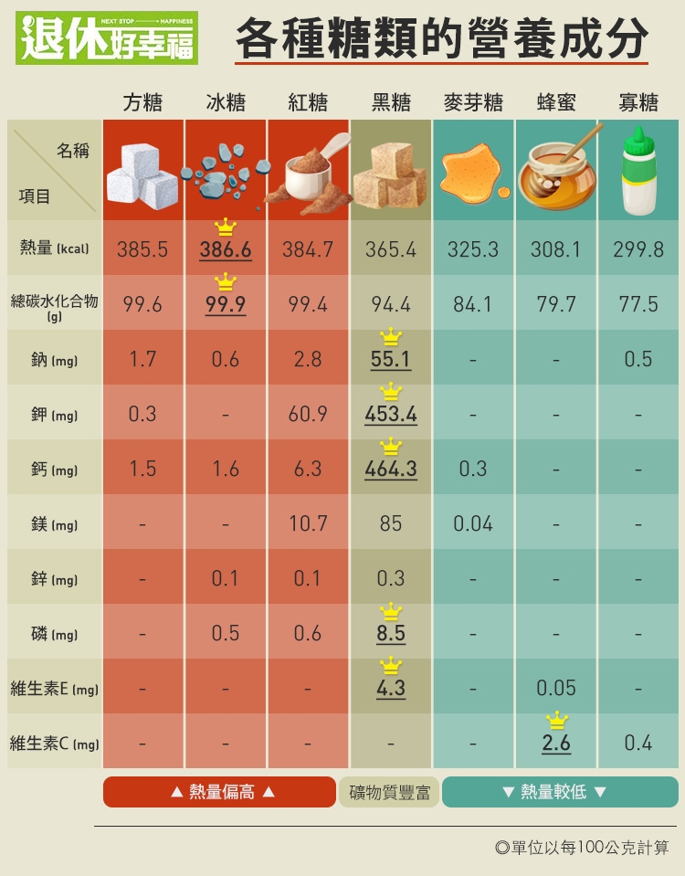 下圖是《退休好幸福》團隊,特別諮詢亞東醫院營養科營養師王若昱,提供各種常見糖類的營養成分與重點,愛吃糖的你絕對要知道。