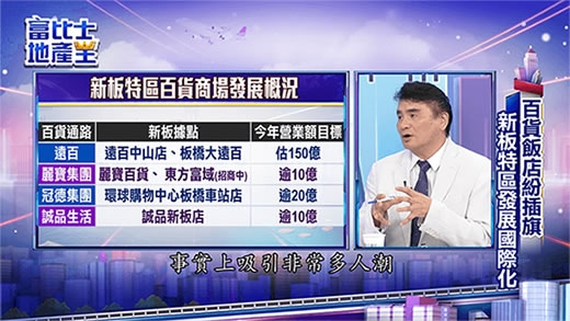 此外,新板特區不但豪宅林立,商業也高度發展,吸引多家百貨業聚集,甚至成為區域的商業中心,而去年新板周邊200億元的百貨業規模,已僅次於台北市的信義商圈、忠孝SOGO商圈居第三大,未來,新板特區將擁有5家國際級大飯店、7家百貨公司,宣告「大新板」戰國時代的來臨。