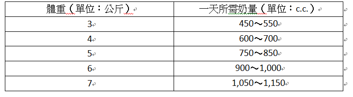 依據嬰兒體重與所需熱量比(30c.c.約供應20卡熱量)的計算方式,在未添加副食品的情況下,每階段寶寶的奶量需求大致如下(副食品的添加會影響寶寶對奶量的需求,添加副食品後可能讓奶量需求持續持平或減少):