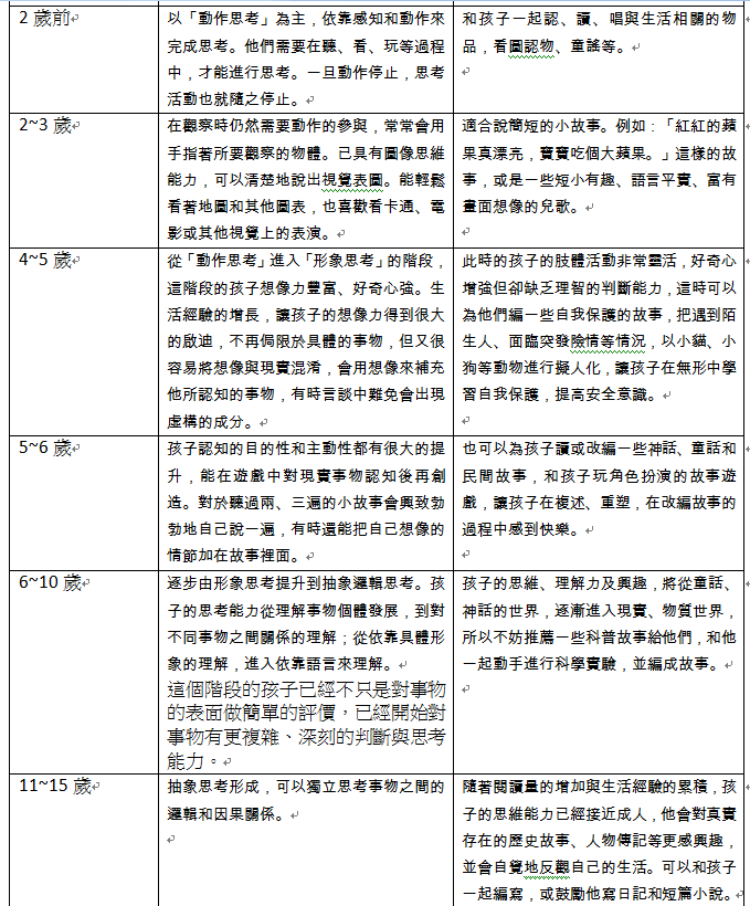 透過下列表格,我們可以更清楚地了解對於各年齡的孩子,他們的思維能力以及對故事的理解能力,再依自己孩子的發展和特性,對故事內容及框架作出相對應的調整。