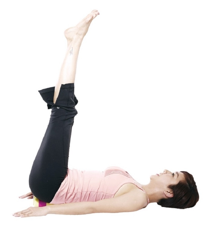 - 吸氣,用腹部力量將雙腿伸直,保持靜止狀態數秒後,再慢慢放下。記得腳背要下壓,並且雙腿跟身體要呈90度。
