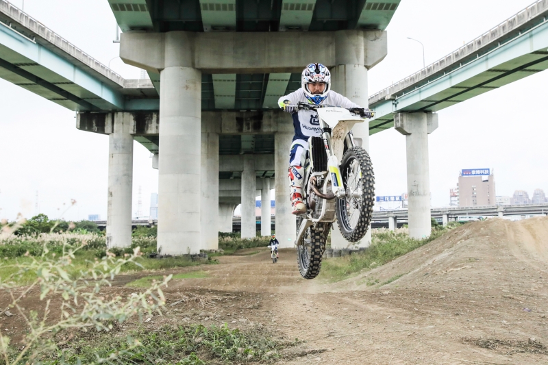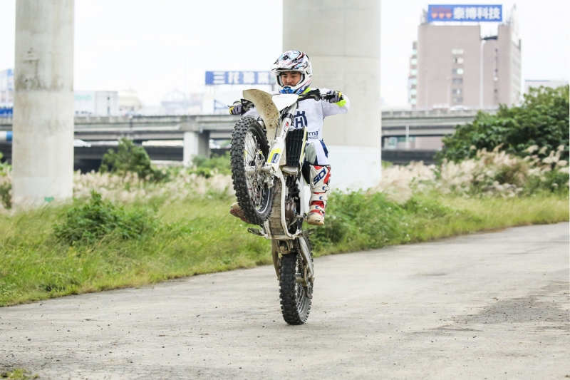 從未到過五股越野摩托車場的柯有倫,在「浩士騎車業」眾多飛車好手的協助下,勘查地形後躍躍欲試迫不及待想上陣,在蜿蜒曲折的黃土賽道區,路線平均30至40公尺處就有一處彎道,眼見他身手矯健連闖9彎道,同時飛越近1公尺高的梯跳土丘及小型跳躍的單飛土丘,純熟身技搏得滿堂采,只見他越騎越熱血,除了高難度動作得心應手之外,到了平地更快速施展「翹孤輪」,為了曾答應不讓媽媽擔心,上陣前他特別戴上護腰做足安全準備,如此精彩的「Alan