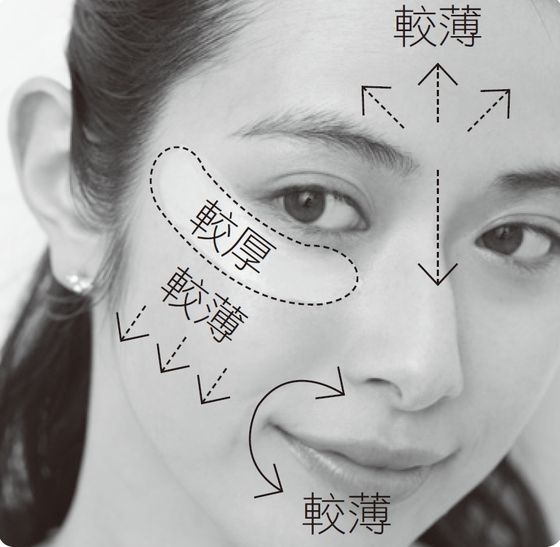 所以,只要在這個部位擦上粉底,看起來就像是個皮膚很好的人。而且其他部位幾乎沒有塗抹粉底,妝容看起來很自然。這樣的「厚度調整」會讓你的皮膚看起來像是天生就很漂亮一樣,能夠營造出「明明有化妝,卻像沒化妝一樣」的自然感的,就只有這個「美肌部位」。