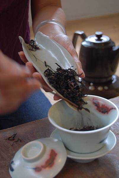 喝完了烏龍茶,接著以瓷器沖泡紅茶,選擇開口較大的茶具,讓茶湯快速沖泡入色,快速倒出不苦澀。