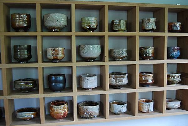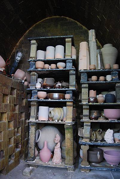 一旁放置升火的木材,內部則以架子擺放各式各樣的作品,除了溫度的掌握,更重要的是多年經驗的累積,以及成品良率控制的學問。