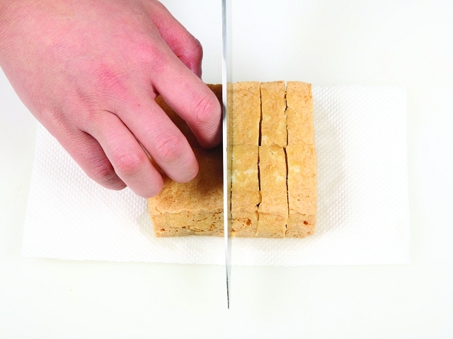 7.把瀝過油的豆腐切塊,使調味醬更好入味(橫切1刀,直切5刀,切成12等分。)