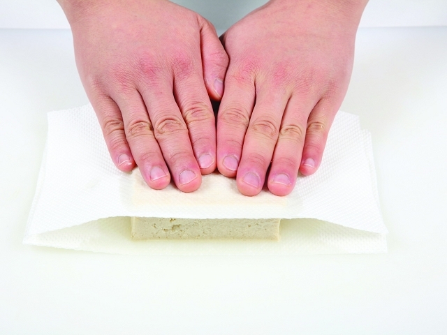 把冷凍過的豆腐泡水解凍後,請先從上下按壓出水分,再拿來料理入菜。