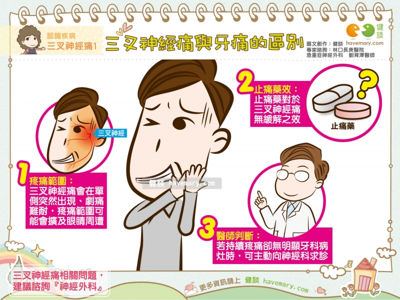 老是覺得牙痛突然發作,莫名發生且又異常疼痛,但檢查牙齒卻沒什麼問題?當心三叉神經痛作祟!林口長庚醫院急重症神經外科劉育澤醫師表示,三叉神經痛常被誤認為牙疼,但可從疼痛的範圍、持續時間與止痛藥的使用等面向著手判斷,或向牙科、神經科醫師就診諮詢,以查明病因。
