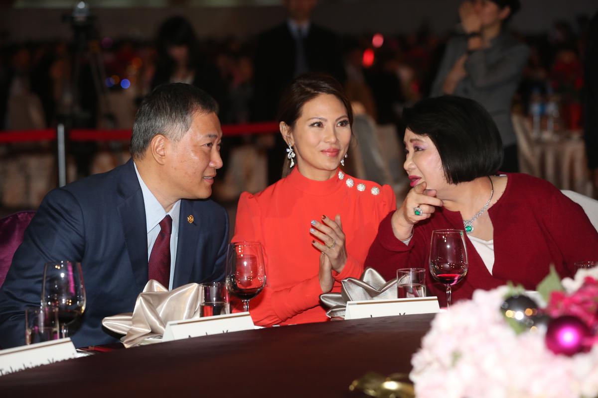 曾就讀西點軍校的他,今天晚會開幕由樂儀隊先出場,穿著一身紅衣連身裙、夫人辜周靖華2人伴隨入內。一就坐,母親辜林瑞慧就先拍拍兒子肩膀,露出欣慰笑容,且不時與鄰座媳婦辜周靖華2人親切交頭接耳。