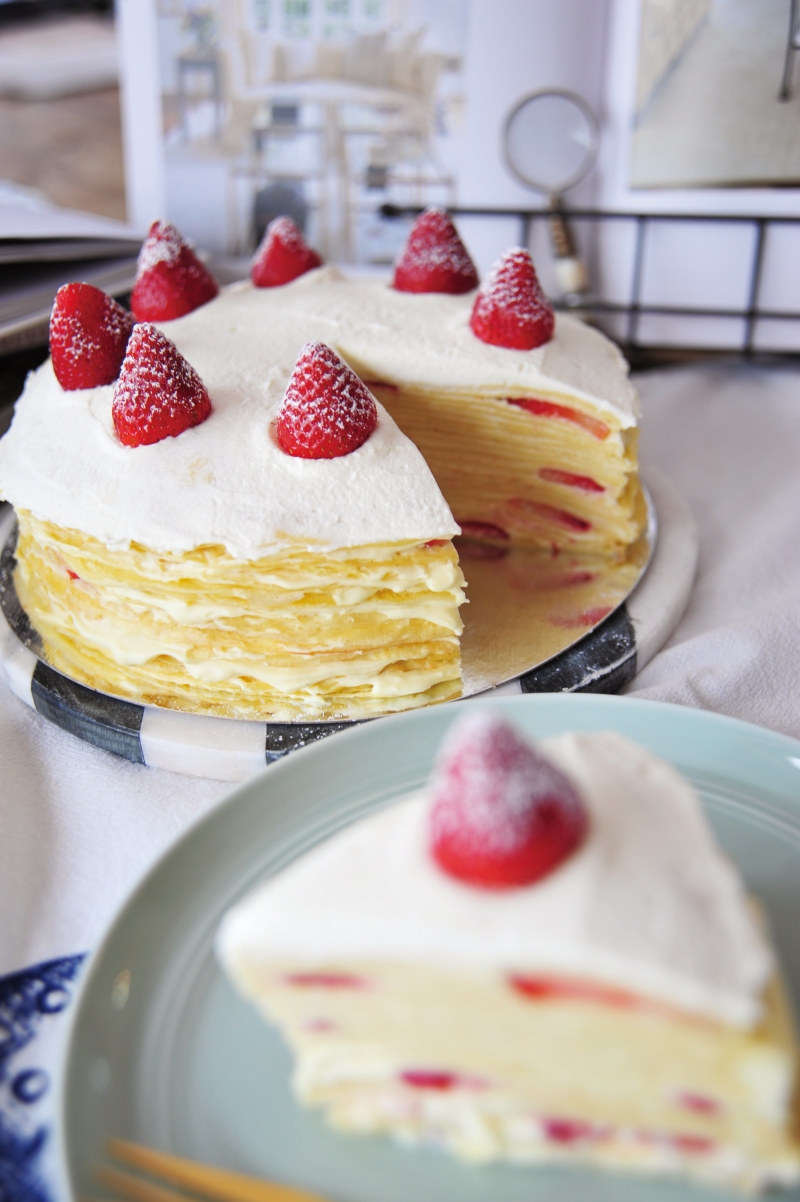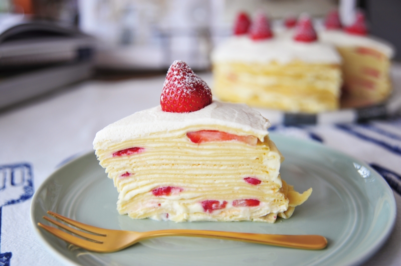 TIPS→建議把完成度較為完美的薄麵皮,使用到千層蛋糕的最上下區段,除了表面好看外,切開後完整的片狀底部才容易以蛋糕鏟移動,不至於破碎。