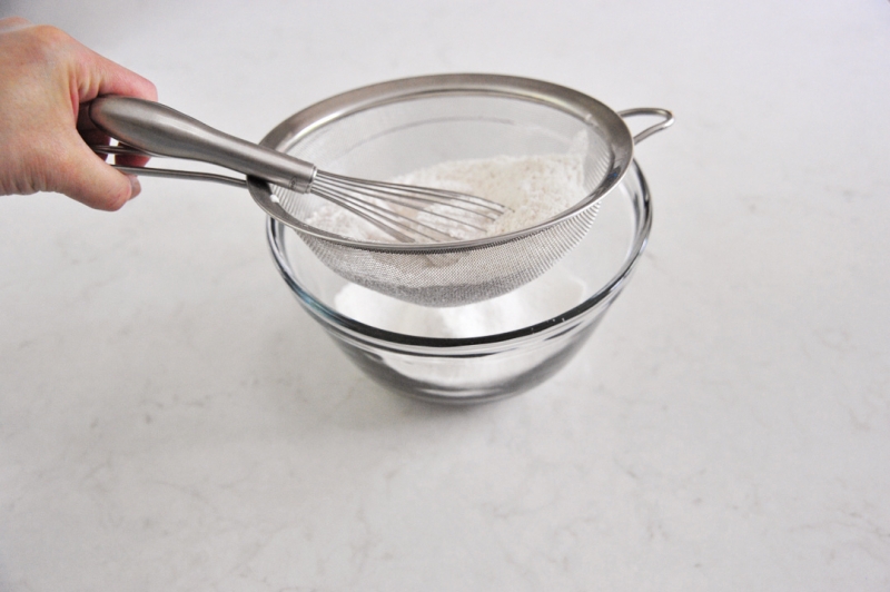 1. 低筋麵粉、糖粉放入大碗中,混合均勻過篩備用。