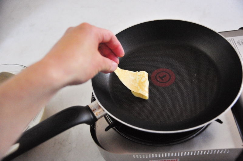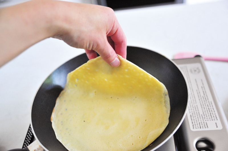 TIPS→麵皮要煎平整、好看、大小一致除了定量每片麵糊外,最重要的是不要在爐火上下麵糊,直火高溫會導致麵糊凝固過快,使均勻度變差。