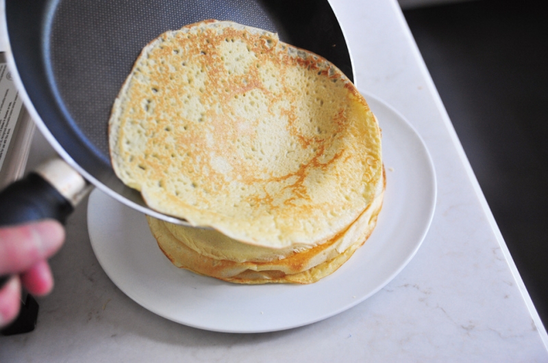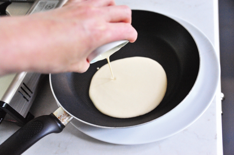 5. 使用7.5吋圓底面積不沾平底鍋,每片麵皮使用35~38克(或烘焙量杯1/3杯的量)麵糊控制完成厚度。