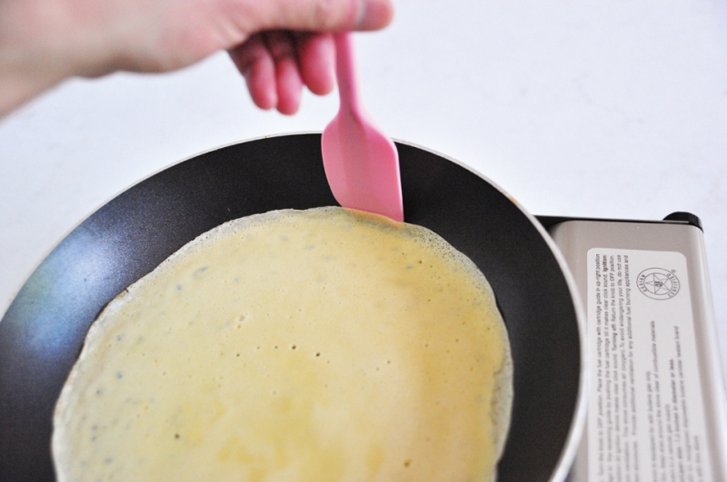 7. 平底鍋離火、倒入定量麵糊,迅速讓麵糊均勻流動披覆在平底鍋上,放回爐火後以小號矽膠刮刀,快速將高出的麵糊推回圓形底面積,這樣才能確保每一片都大小一致。