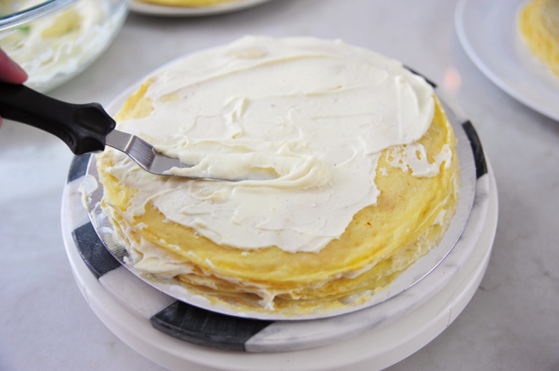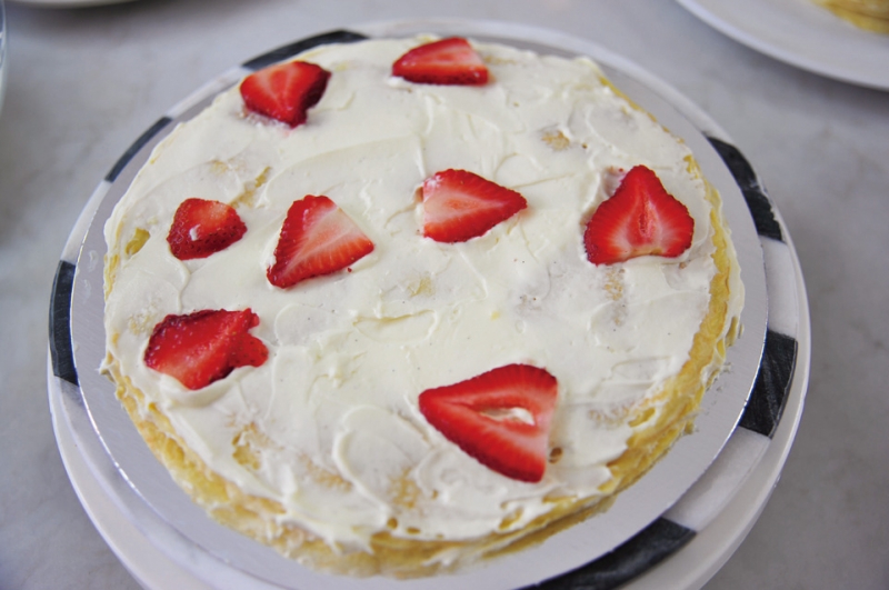 13. 使用蛋糕底盤或甜點專用紙板當底,鋪上第一層薄餅皮,以蛋糕抹刀輔助,輕薄地抹上卡士達鮮奶油醬,依此類推,逐步往上堆疊薄麵皮與抹醬,如要放入水果夾心,須顧及平衡、與每層間的水平保持一致。