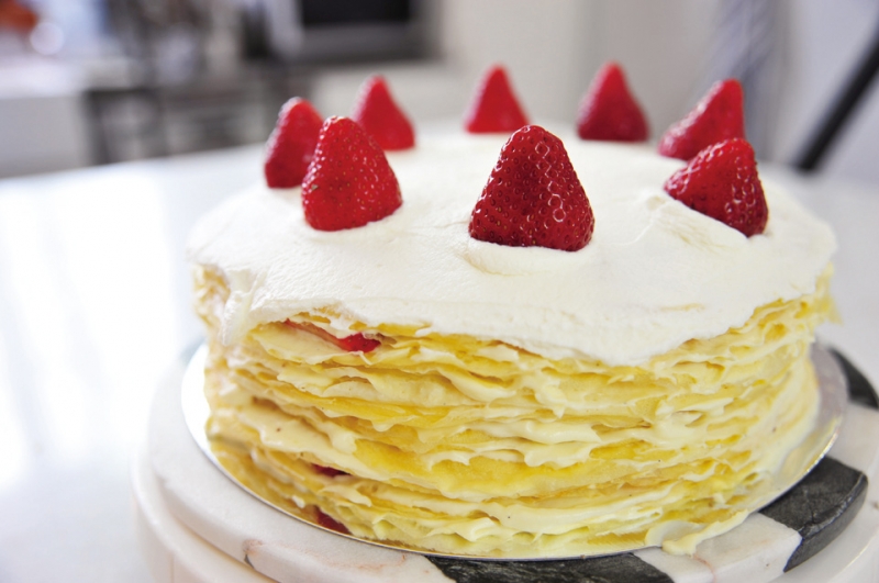 在眾多法式甜點中, 原本就有將同樣麵糊, 將餅皮煎到柔軟狀態就離火的做法。一般是交錯堆疊約3 ~ 4 片柔軟餅皮,並以夏綠蒂蛋糕模(Charlottemould)幫助成型,然後在中間淋上包裹特製奶油水果醬的一種蛋糕, 稱之「Crêpes gâteau」(可麗餅蛋糕)。當然這份被紐約名店發揚光大的千層蛋糕也很有特色,不少人是她的忠實粉絲。